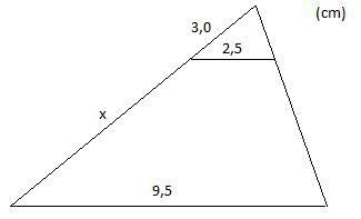 Beräkna x. Linjen inuti triangeln är en parallelltransversal.