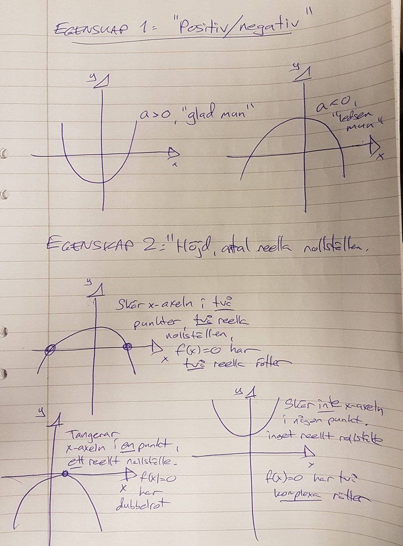 • Det här fallet ingår inte i Matte 3, så det behöver du nog inte kunna, men ändå: Om grafen inte skär x-axeln i någon punkt så har andragradsfunkrionen inget reellt nollställe, andragradsekvationen f(x) = 0 har två komplexa rötter. Exempel: f(x) = x^2 + 8. (diskriminanten är negativ)