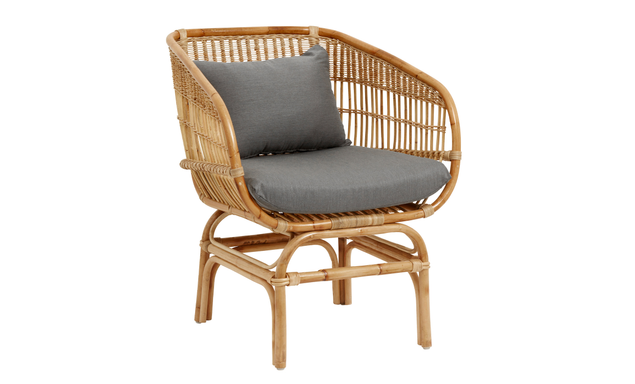 En fåtölj där sitsen är gjord av rotting, till exempel
