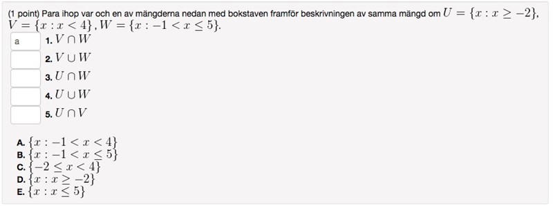 Om vi börjar med 1. Där ska alltså snittet mellan V och W hittas. Jag tänker att V: x<4 blir ju typ 3,2,1,0,-1 osv. Och W: -1<x5 så det borde ju vara 5, 4, 3, 2, 1, 0 osv till -1. Och då borde väl snittet bli 3, 2, 1, 0? Men det finns ju inte ens som alternativ? Var tänker jag fel? Tack på förhand