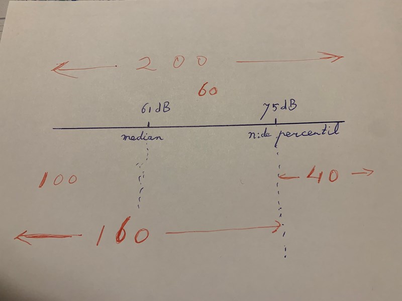 Medianen är 61 decibel och det är totalt  200 mätningar, alltså 100 under 61 dB och 100 över 61dB. Visst?