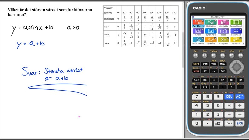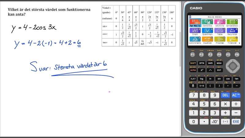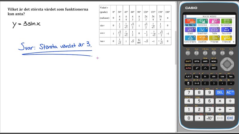 Funktionerna och pendlar mellan -1 och 1, för alla reella tal k och x. Det är bra att komma ihåg, men det framgår även i tabellen som följer med i uppgiften.