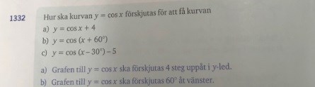 Testa att skriva in y=cos x i GeoGebra och se hur kurvan ser ut. Skriv sedan in uttrycken i a), b) och c) och se vad som händer med kurvan.