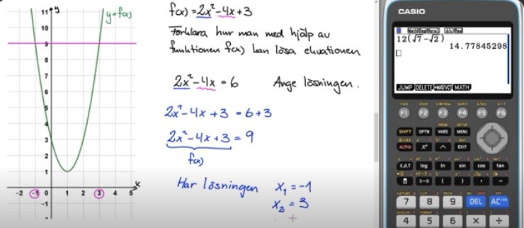 och kan därmed jämföra grafen y=f(x) med linjen y=9. Där de skär är de sökta x-värdena och lösningarna till ekvationen