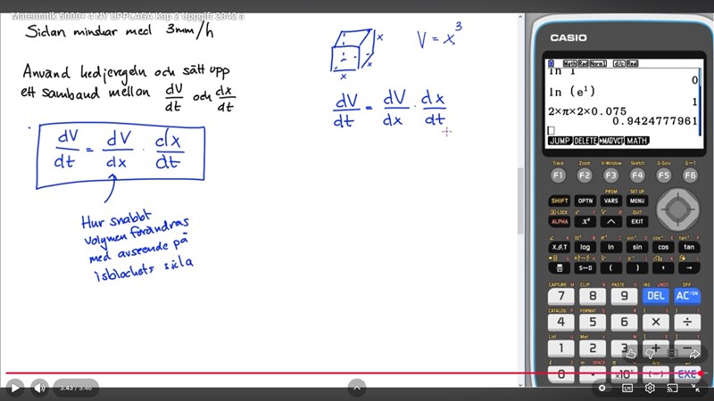 Jag förstår inte riktigt hur man ska tänka här på denna uppgift, jag förstår inte hur kvotregeln har en koppling, o sen vrf svaret blir dv/dx * dx/dt? liksom jag är inte med på tanken, vet ej hr jag ska lösa sånna uppgifter på provet