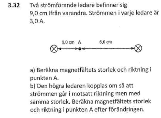 Jag tänkte ju att eftersom de båda ledarna går mot punkten A så tar de ju inte ut varandra. Så då tänkte jag att räkna ut först vad magnetflödestätheten är på vänster sida och sedan addera det med höger sida och sedan då får vi ju svaret. Men enligt facit är ju det fel, så jag undrar vad ska jag göra för att räkna ut svaret?