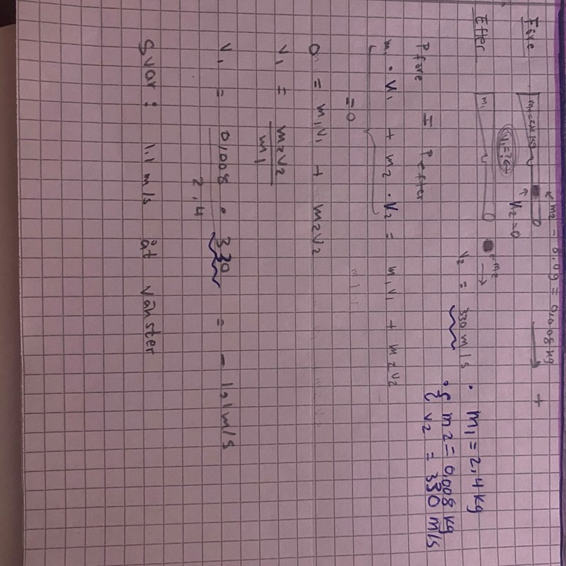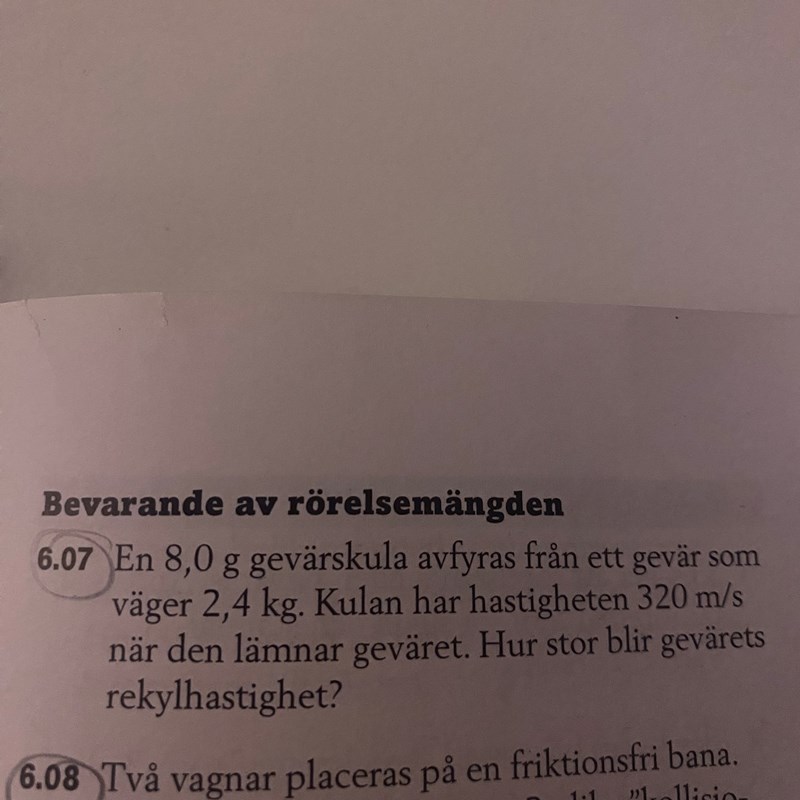 Rörelsemängden kommer vara konstant och det betyder att V1*m1+ V2m2 innan reaktionen kommer vara lika med V3*m1+V4*m2 efter reaktionen. Ty hastigheten på kulan V2 och geväret V1 är noll innan reaktionen får vi då formeln 0=V3*m1+V4*m2 nu ska vi försöka isolera gevärets hastighet efter reaktionen genom att köra minus V4*m2 på båda sidorna och delar båda sidorna med m2. Anledningen till att det inte blir ett minus tecken i  ekvationen är för att personen som skrev den inte brydde sig om hastighetens riktning tills svaret då hen lägger till det.