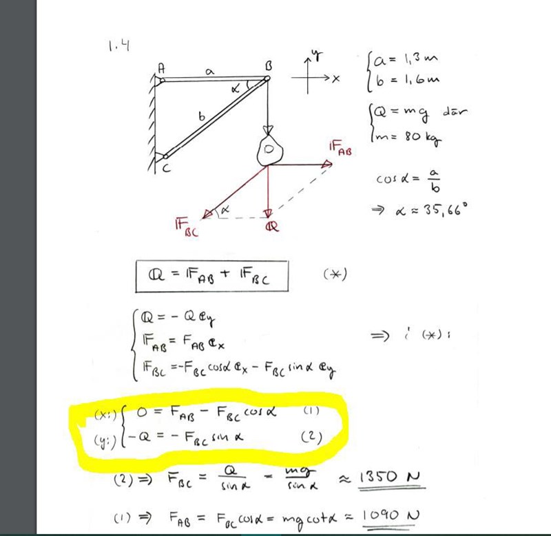 Hej! Nu i början av Mekanikkursen repeterar vi gymnasiets fysik och matte. Det var längde sen jag gjorde fysikkurserna på gymnasiet. Vi skulle dela upp kraften av en vikt D med massan 80 kg som hänger ner från två stöttor på de två stöttorna. Jag räknade fram 80 gånger 9.81 och fick fram 785 Newton. Sen efter en halvtimme kollade jag facit. Där förstod jag allt utom hur de fick fram ekvationerna som jag har markerat med gul färg.