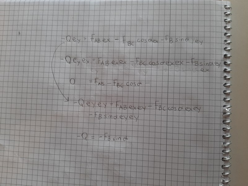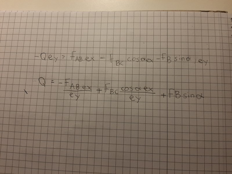 Titta på de tre ekvationerna som står innan (1) och (2). Uttryck Ekvationen Q = FAB + FBC med hjälp av dessa tre ekvationer och samla x och y-komponenterna separat så får du (1) och (2).