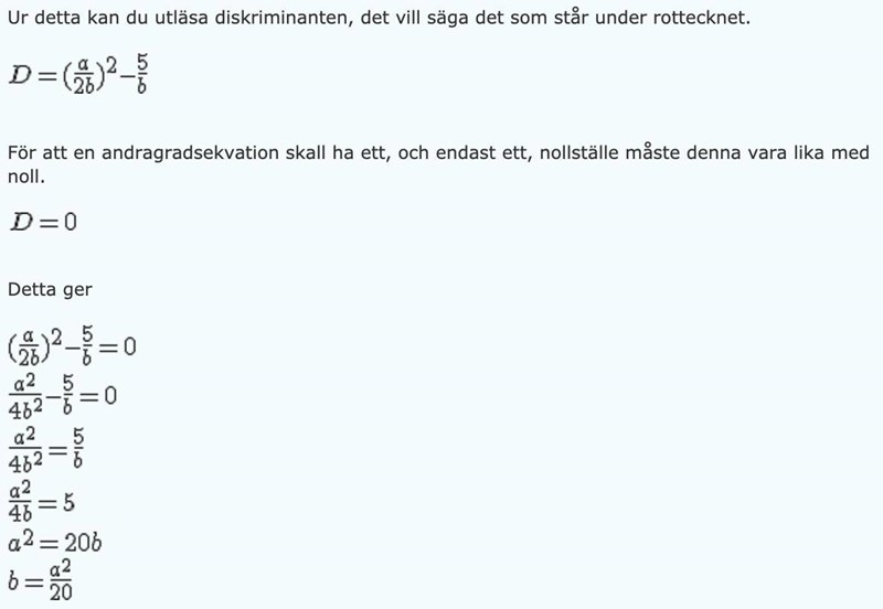 Smaragdalena skrev:Personen tar reda på vilket värde på b som gör att andragradsekvationen bx2+ax+5=0 har en dubbelrot, d v s tar reda på vilket värde på b som gör att diskriminanten blir lika med 0, d v s löser ekvationen med avseende på b.
