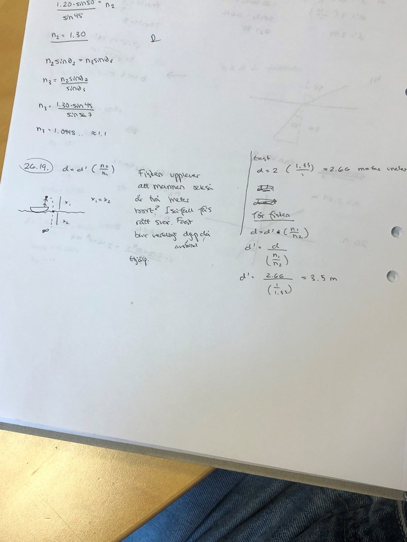 där = upplevt djup, =det faktiska djupet, är brytningsindex genom medium 2, vilket i detta fall är vattnet och därmed 1.33 och är brytningsindex i luften, alltså 1.00.