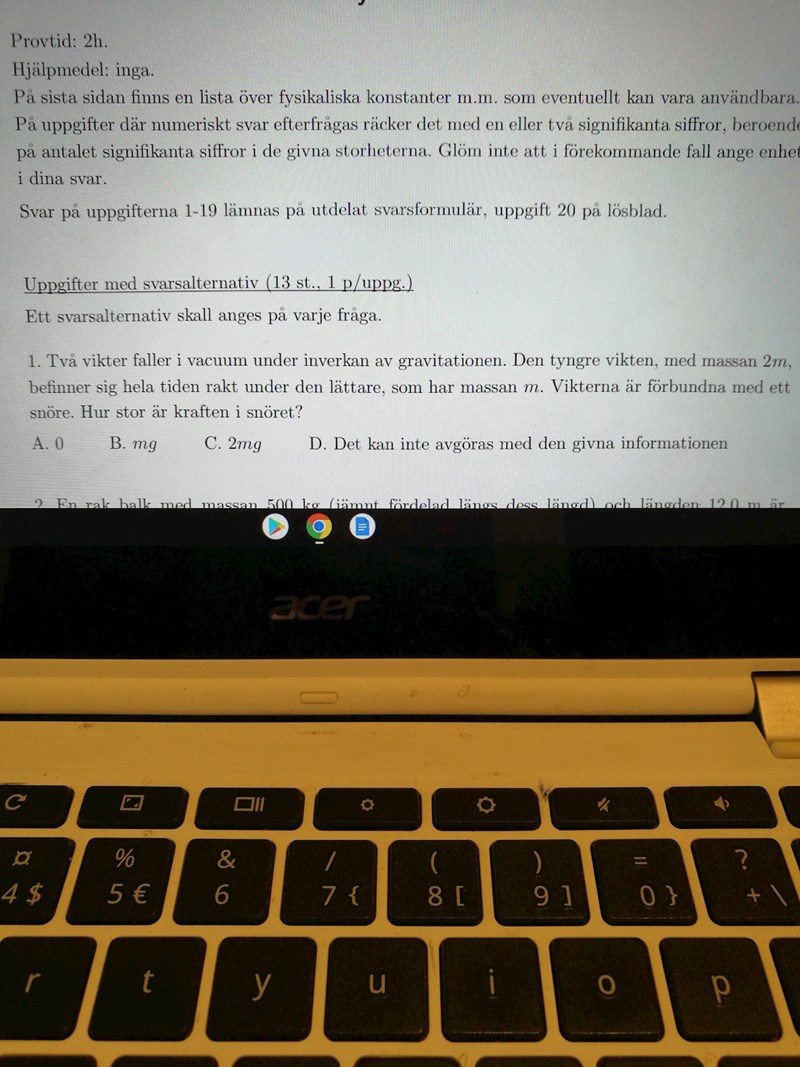 Ja den kraften är 0 enligt facit för de tänker att vikterna ej känner någon sån kraft förutom mg då?