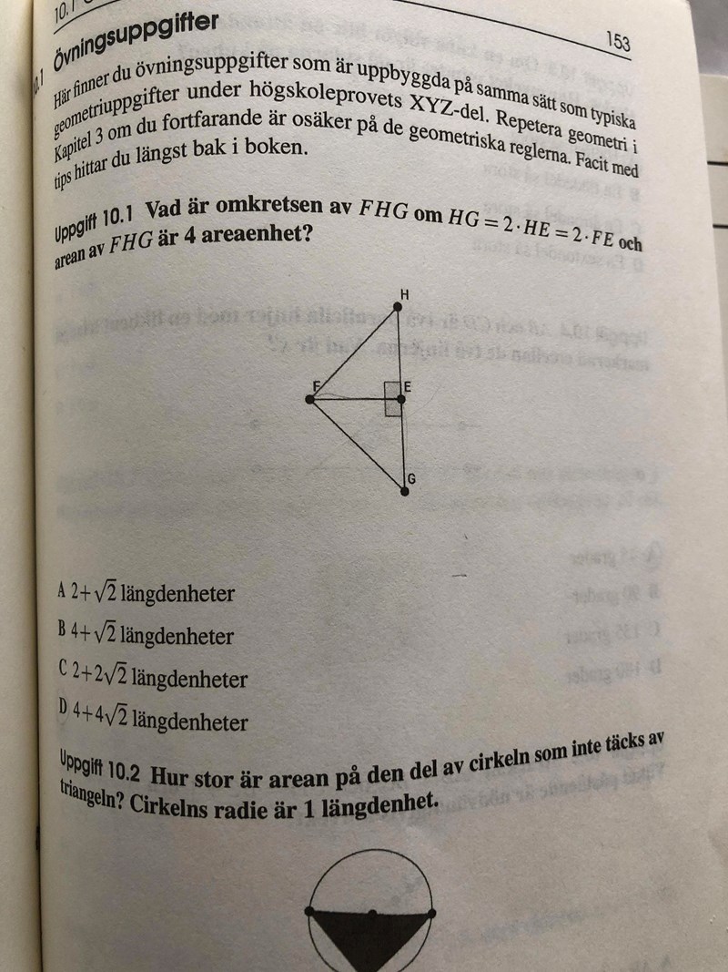 Uppgift 10.1 Vad är omkretsen av FHG om HG= 2•HE = 2•FE och arean av FHG är 4 areaenhet?