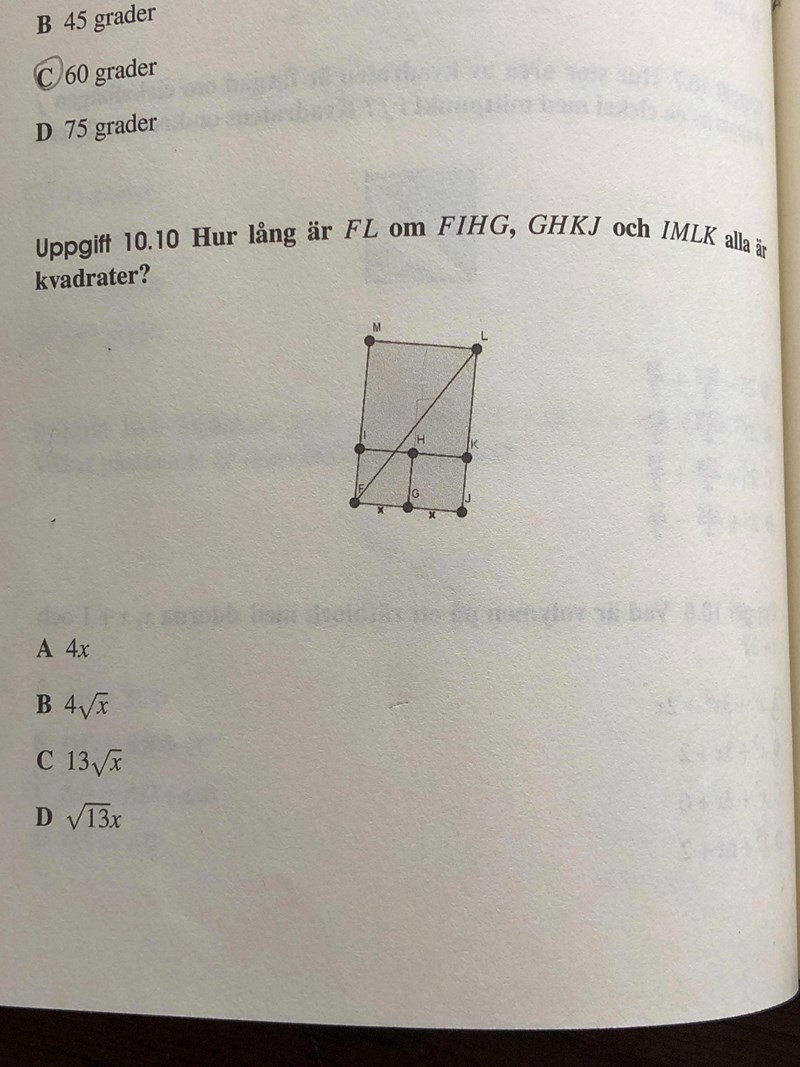 Uppgift 10.10 hur lång är FL om FIHG, GHKJ och IMLK alla är kvadrater?