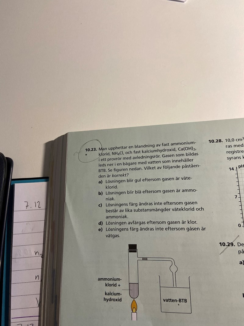 Hej! I uppgift 10.23 i boken Gymnasie kemi 1 så ska man välja mellan 5 olika påståenden om en gas som blir till, men först måste man lista ut vilken gas som bildas och det är det jag behöver hjälp med. NH4Cl (s) och Ca(OH)2 (s) upphättas i ett provrör med ett avledningsrör. Gasen som bildas leds ner i en bägare med vatten som innehåller BTB. Sedan ska man välja mellan 5 påståenden om vilken gas som bildas och vilken färg vattnet får. Jag försökte men förstår inte hur man ska veta vilka ämnen som går ihop och vilken gas som bildas! Finns det någon regel som vid fällningar?