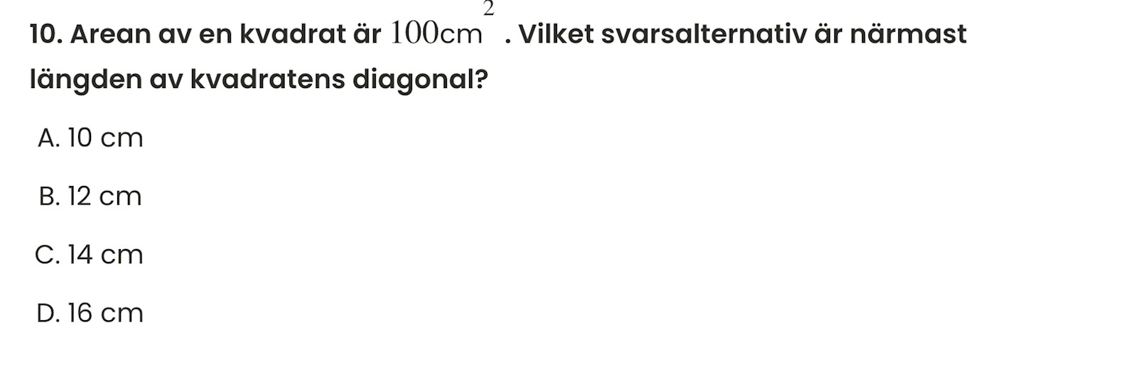 om arean är 100 cm2 är sidorna 10 cm (ger arean 10*10 = 100)