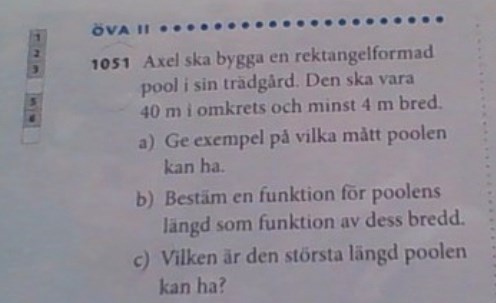 Varför 40-2x är fel? Där drar du bort två bredder från den totala omkretsen. Det som återstår då är två längder. Så, detta halveras för att få *en* poollängd.