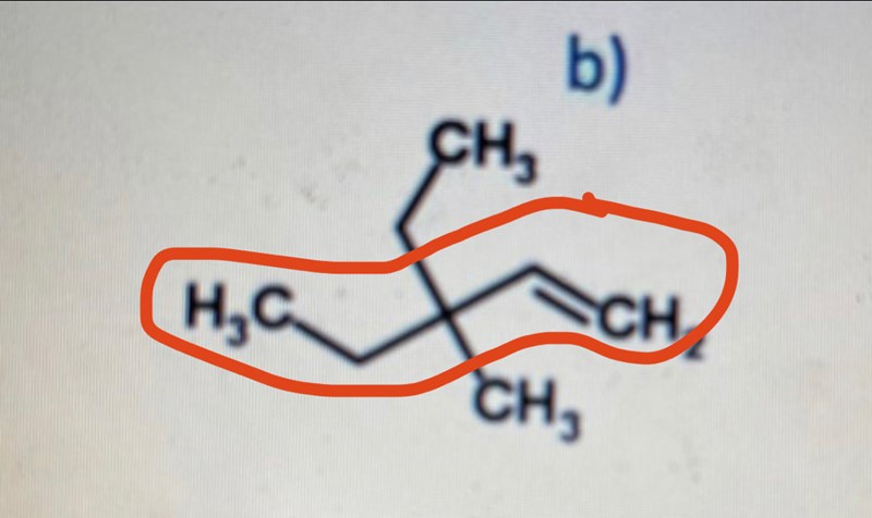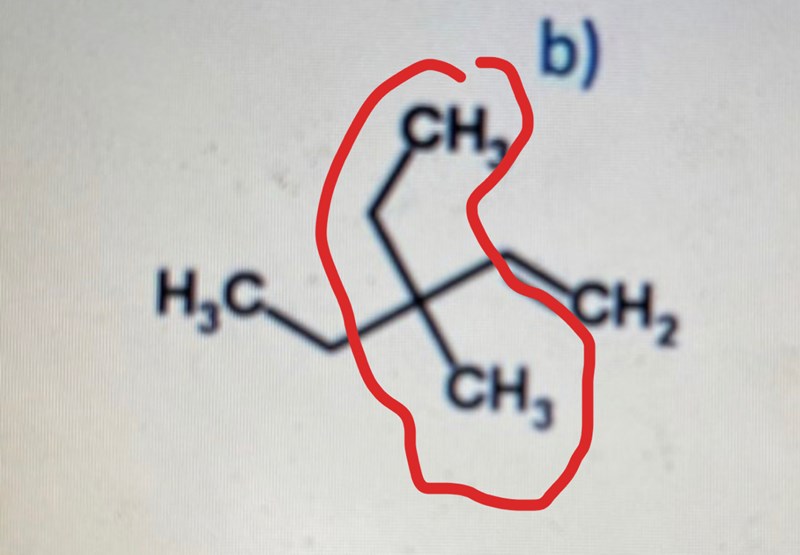 2,2 dimetyl-3buten… Vart kommer etylgruppen ifrån? Vilka fel har jag gjort? Hur ska man tänka här? Vore tacksam om jag kunde få hjälp med hur man ska tänka när man namnger den här molekylen