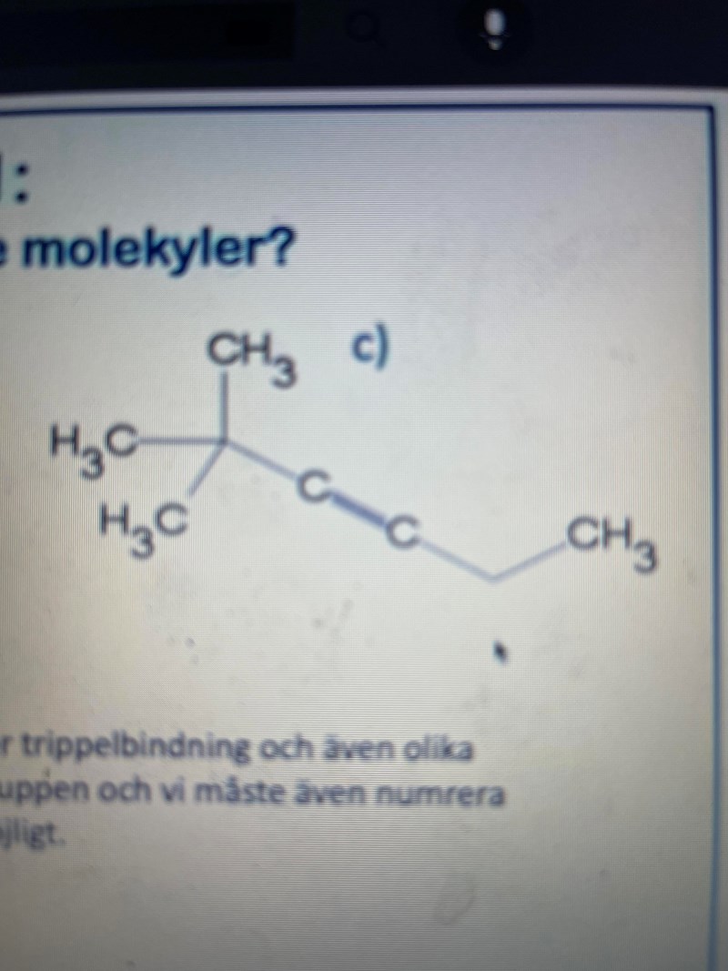 Det är 6 kol i den längsta kolkedjan, och det är en trippelbinding, så namnet skall sluta på hexyn. Trippelbindningen är mellan kol nummer 3 och 4 från vilket håll man än räknar, så 3-hexyn är rätt. Det finns två metylgrupper, båda sitter på kol nummer 2, så det är 2,2-dimetyl-3-hexyn. Precis som tidigare har man ritat ut kolet och vätena på de yttersta ändarna, men inte annars.