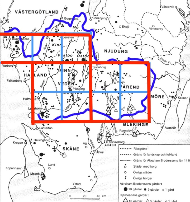 Första kravet är att veta hur stort området är på kartan. Annars kommer vi inte vidare. Nu ritade jag väldigt noga och det skall du inte göra. Jag hade tagit ut ett par punkter och dragit räta linjer mellan dem så att man får en polygon. Då tror jag att man hade sett att området påminner om ditt röda område. Man skulle då kunna flytta kvadraten över Kungsbacka och området för Mo (ej inramat) till 2 nya kvadrater över Njudung och på så sätt få en rektangel som är 4*40 x 3*40 = 12*40^2 = 19200 km^2. Det tror jag är det enklaste. Sedan behöver man inte beräkna produkten så noga. Den är ungefär 10*40^2 = 16000 vilket är nära det svarsförslag som finns. Nästa högre svar är 70 000 tror jag och det är helt fel. Nästa under är 7000 tror jag och det är lika fel. Ibland är det dock farligt att vara alltför slarvig i räkningarna och grov i uppskattningarna då svarsförslagen ligger nära varandra, men här ligger de en bra bit ifrån varandra.