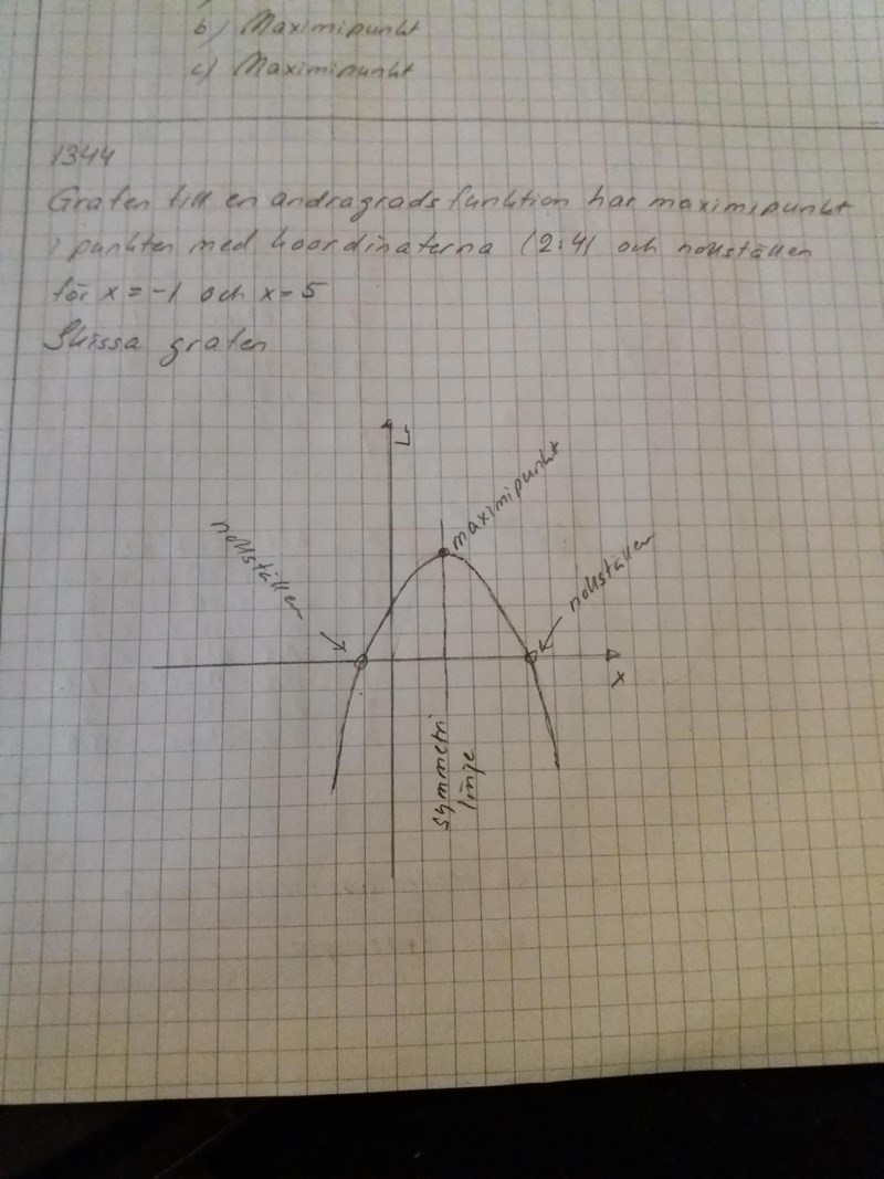 Jag förstår att du menar att 1 ruta = 1 enhet och maxpunkten samt nollställena sitter där de ska. Men det är bra om du graderar x-axeln och y-axeln så att man vet hur mycket en ruta är värd. T.ex. kan du sätta en 1:a på x-axeln där x=1 och en 1:a på y-axeln där y=1.