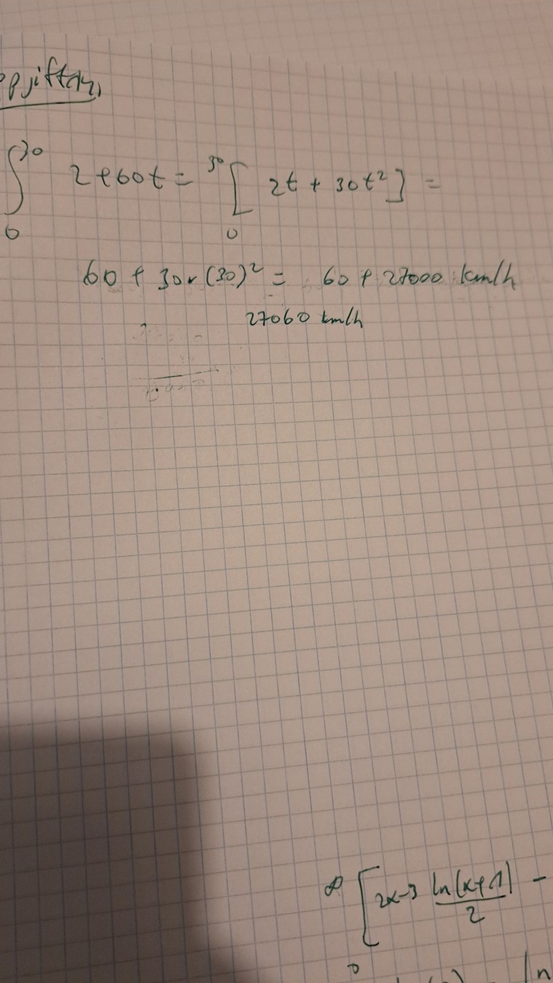 Ett fordon startar från stillastående och kör 30 minuter rakt framåt med accelerationen 2+60t km/h^2. Vad är fordonets hastighet efter 30 min? Hur långt hinner fordonet?