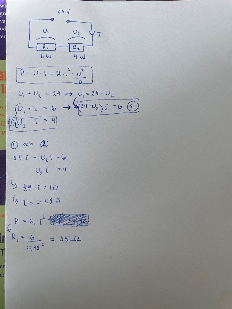 Hmm men i uppgiften står det ju 6W och 4W över motstånden när de är kopplade i samma krets?