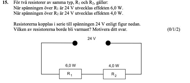 Det handlar om tre olika kopplingar: En där man lägger spänningen 24 V över R1, då utvecklas effekten 6,0 V. En annan där man lägger spänningen 24 V över R2, då utvecklas effekten 4,0 V. En tredje där man lägger spänningen 24 V över de båda seriekopplade resistorerna. Det är bar den tredje kopplingen som är avbildad.