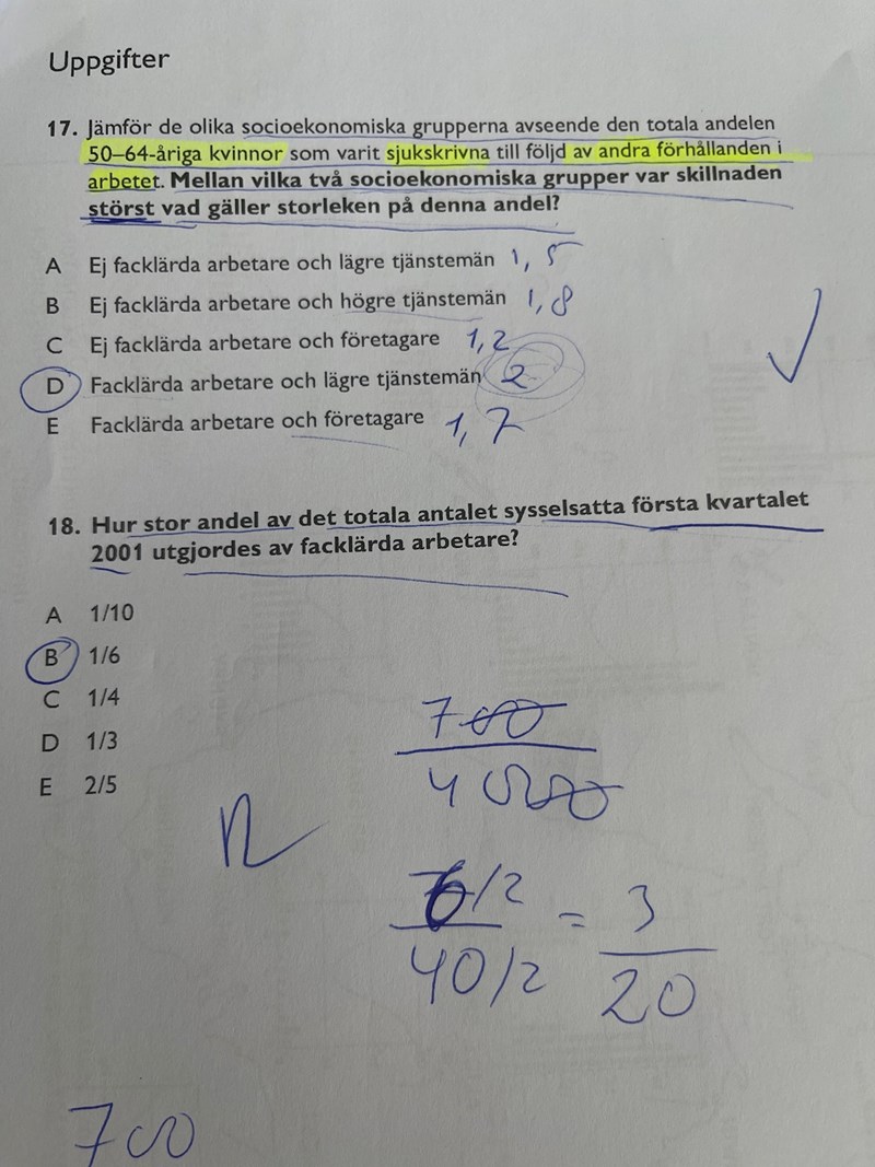 jag förstår inte varför mitt svar är fel i uppgift 17. Det står ”störst skillnad”, den första skillnaden i andel fick jag i svarsalternativ D. Men i facit är svaret C vilket motsvarar den minsta skillnaden.