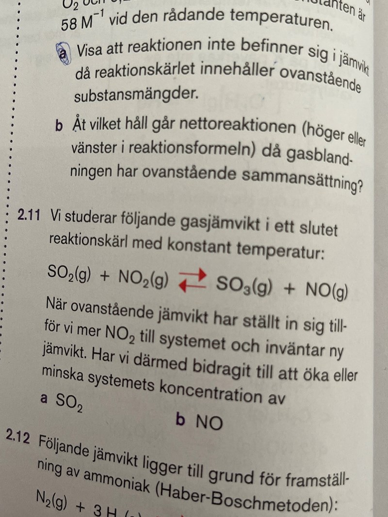 Hej! Jag undrar hur man ska tänka i 2.11 b , hur ska man resonera och förklara att koncentrationen av NO minskar när man ökar koncentrationen av NO2?