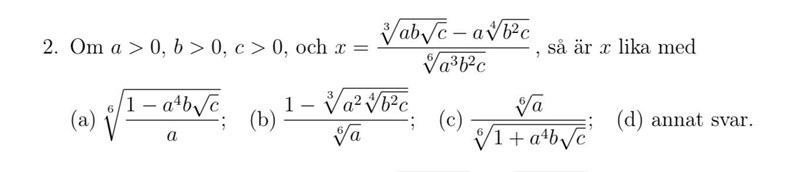Var kom alla plustecken ifrån? Och jag menade att nämnaren bara ska vara a6\sqrt[6]{a}, så som det är i svarsalternativen. b och c ska alltså förlängas bort från nämnaren.