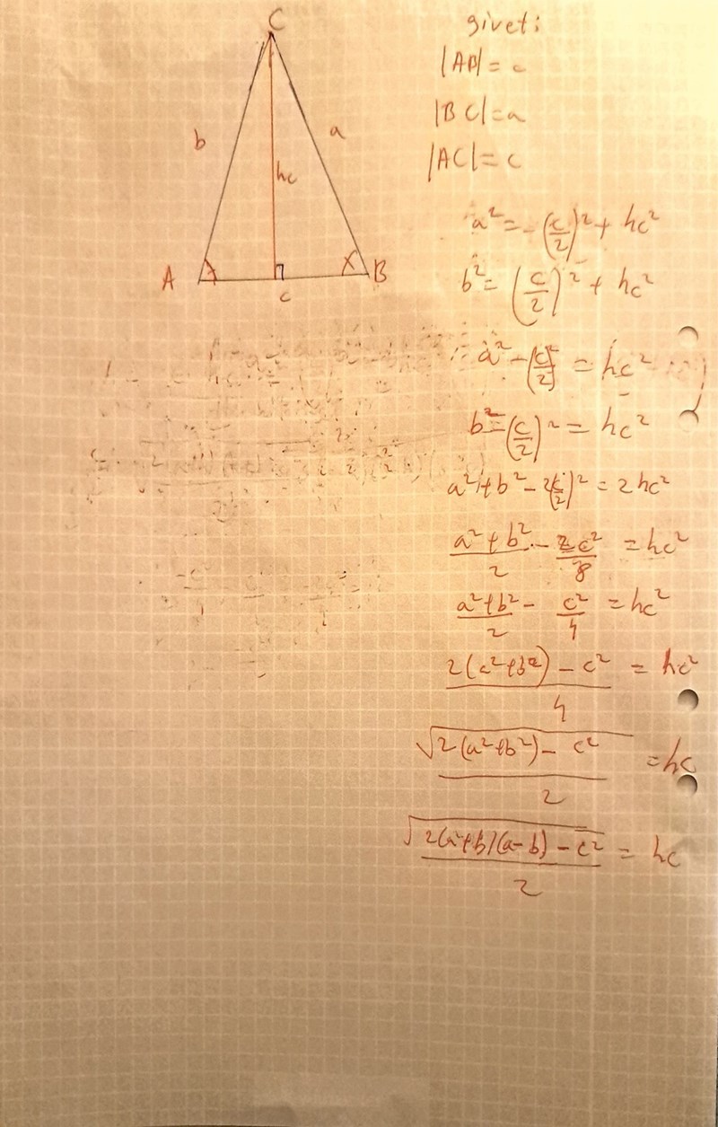 Pedagogiskt var detta kanske mindre lyckat eftersom H:s formel (tyvärr) har tagits bort ur gymnasiets kurser. Men det hade fördelen att jag slapp befatta mig med frågan vilket som var höjd och vilket som var bas.