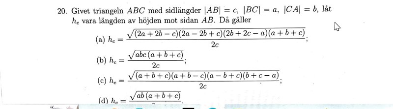 Hur menar du? Ska vi ej använda heronsformel o utveckla den för att se vilket alternativ som är rätt??