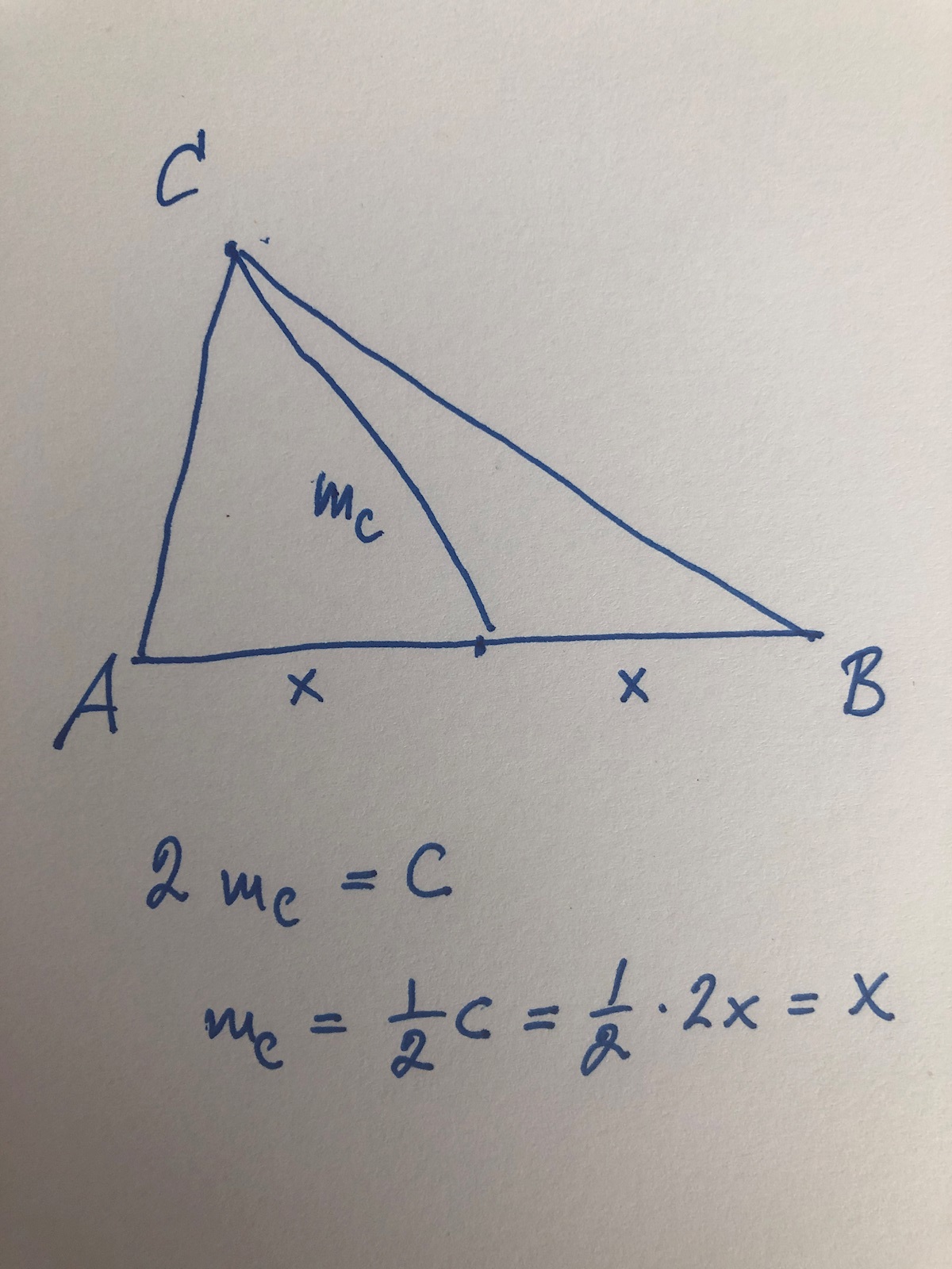 Här ser vi att m_c=x och därmed är x, x, och m_c alla radier i en cirkel med radien x och medelpunkt där medianen träffar AB. AB är alltså en diameter och randvinkelsatsen säger då att vinkeln ACB är 1/2*180°=90°. ABC kan inte vara något annat än rät om 2m_c = c, och omvänt, en rät triangeln uppfyller 2m_c = c.