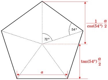 En möjlighet är att vi har en likbent triangel med sidorna a längst ned. Om vi delar den i två lika delar så får vi två rätvinkliga trianglar som delar vinkeln 108o i två delar till 54o, vilket i sin tur gör att vi får vinklarna 36o givna. Då blir det givet att vi har två 108o vinklar som möts i mitten.Prova att räkna ut vinklarna, så tror jag att du ganska fort ser mönstret med de stora trianglarna som hör till varje hörn med 108o i mitten och 36o i de två spetsiga vinklarna.