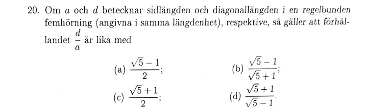 Många smarta lösningen här i tråden! Min spontana tanke när jag såg detta var denna: vinkeln mellan två sidor är 108°, vilket innebär att vi kan dela den triangel som har sidorna a, a och d, på mitten. Då får vi en rätvinklig triangel med sidorna a, d/2 och en vinkel på 54°. Om vi låter a vara 1 (för enkelhetens skull) är då d/2 lika med . Eftersom vi satt a till 1, får förhållandet d/a också detta värde.