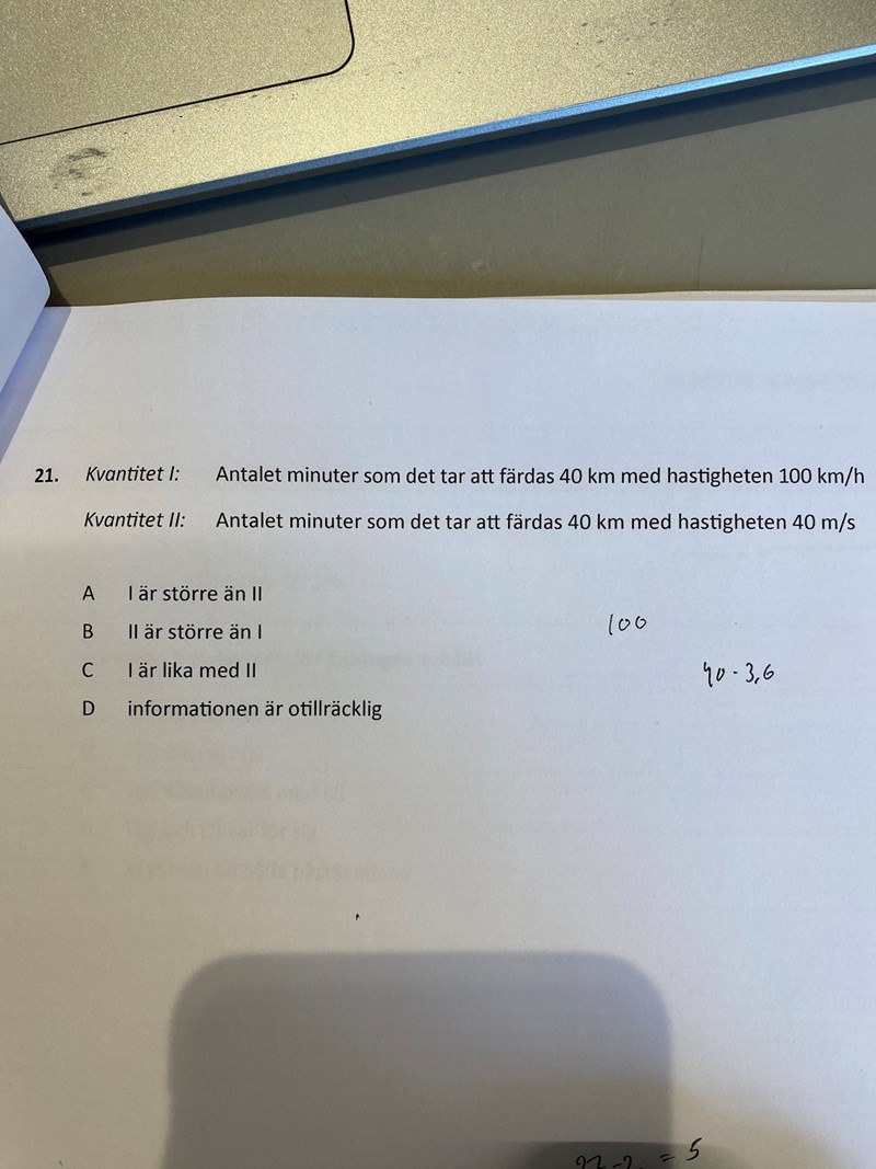 Jag räknade ut hastigheten 40 m/s till att det blir 144 km/h och svarade därför Alt.B att II är större än I.