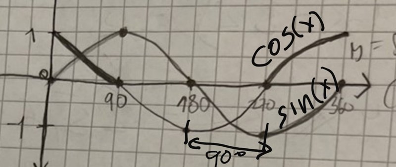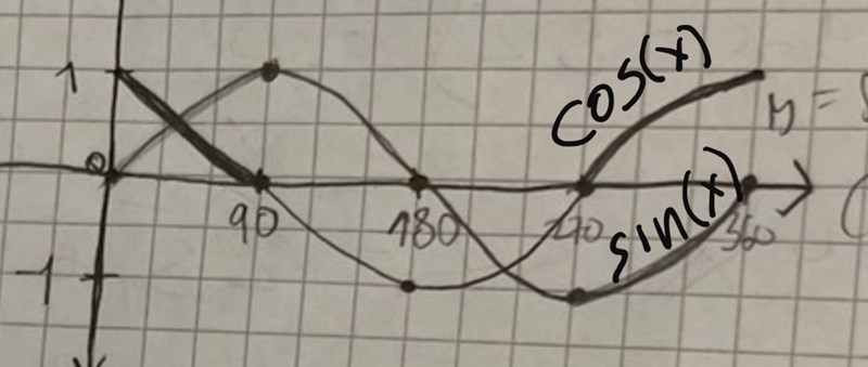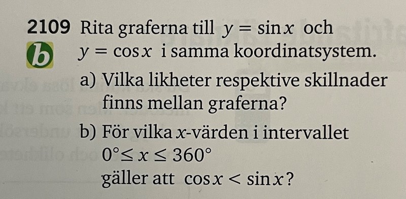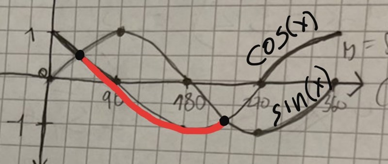 Hej! Kan någon hitta felet i min lösning för på facit står det dels att grafen ska vara förskjuten 90 grader. Och att cos x < sin x mellan vinklarna