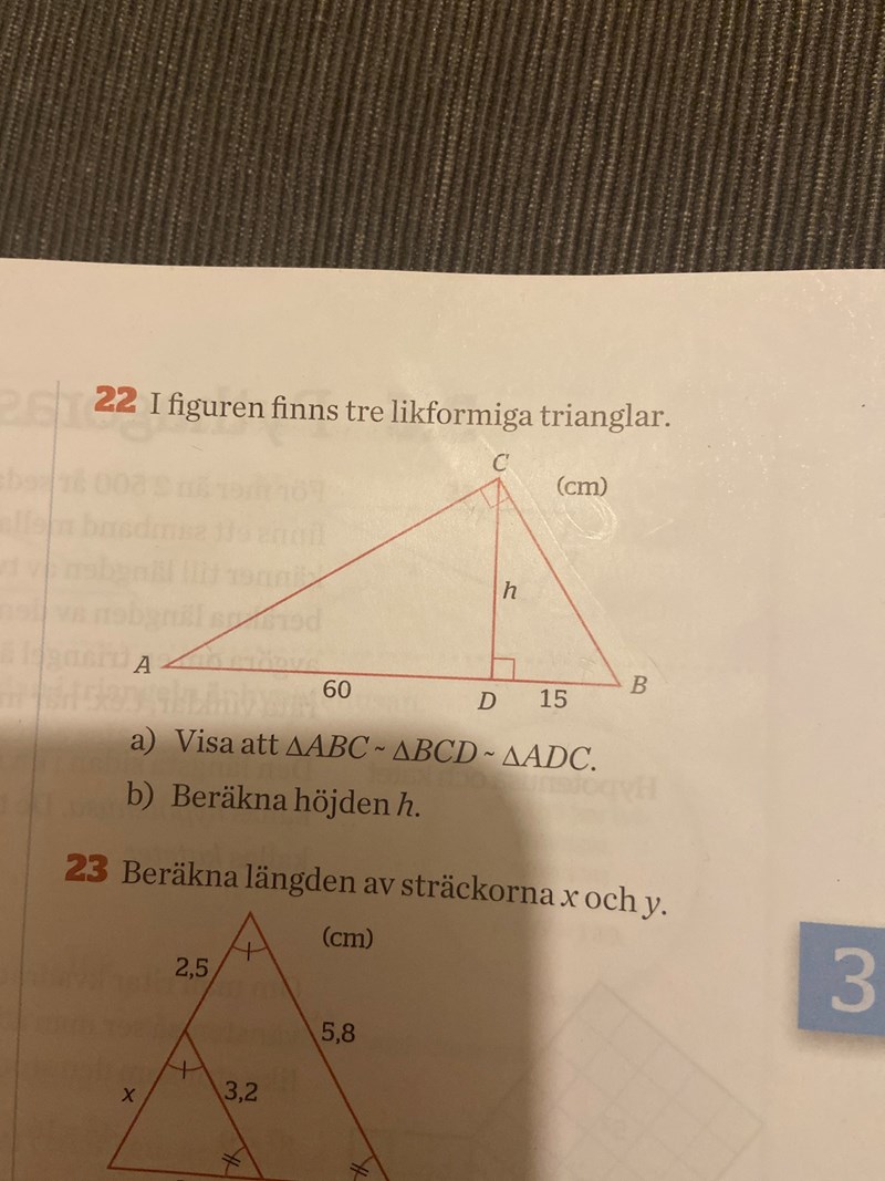 Och i b av att förhållandet mellan sidorna t.ex kateterna är lika i två likformiga trianglar