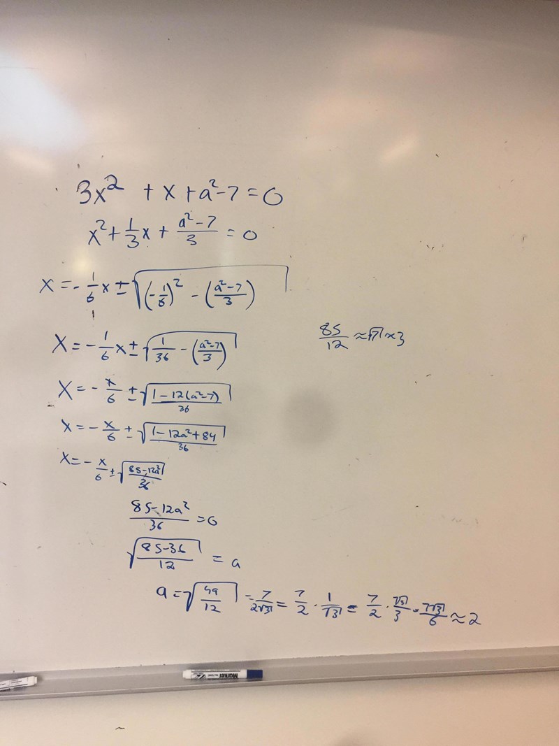 Ange det största heltal a sådant att ekvationen 3x^2 + x + a^2 − 7 = 0 har minst en reell lösning.