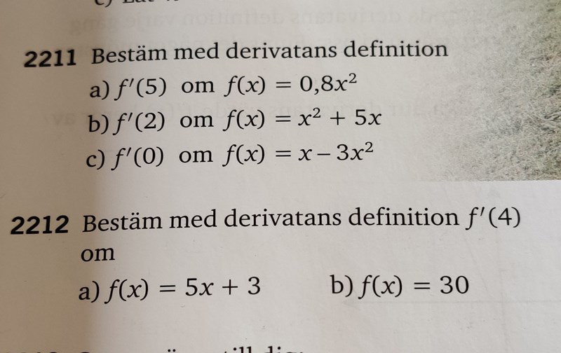 Metoden är följande: Derivatans definition säger att . Om du ska använda dig av denna definition behöver du först hitta vad är, dvs. att du sätter in som i funktionen. I detta fall är x ett givet tal Om du sätter in respektive 5 i , vad får du ut? :)