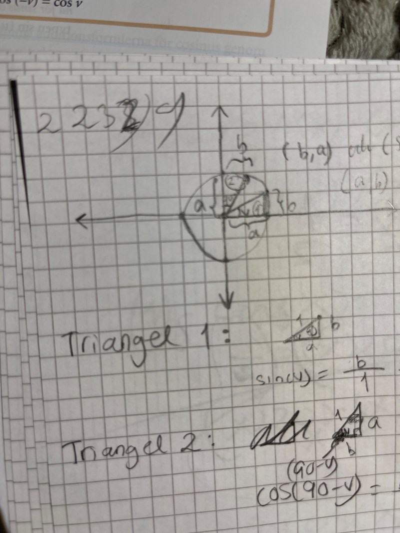cos(v)=a/1 = a (a är punkten på x-axeln rakt under där hypotenusan träffar cirkeln)