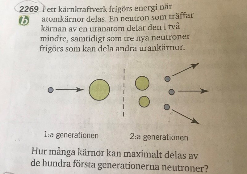 Jag förstår att det är en geometrisk summa som jag ska räkna k=3 och a=1 men de frågar efter ”Hur många kärnor kan delas av de hundra första generationerna neutroner?” Om jag sätter in 100 får jag antalet neutroner och inte urankärnor? För vi räknade ju k och a för neutroner och inte urankärnor? Kan någon förklara