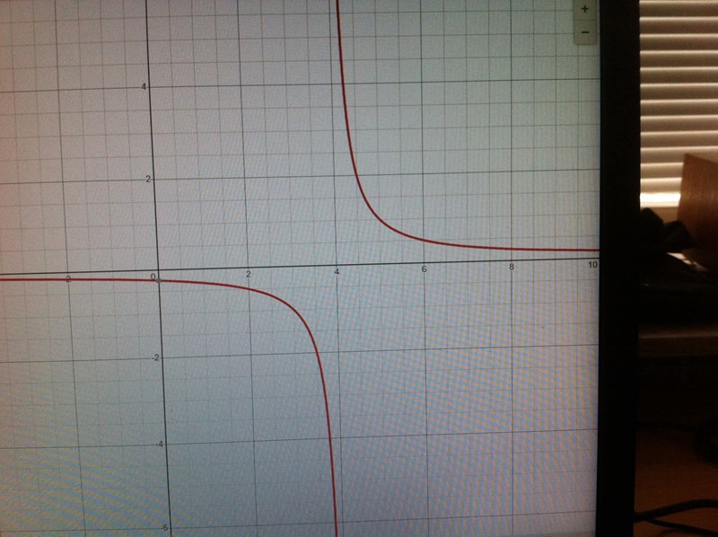 Ja, din graf är fel. Den föreställer inte ens en funktion - om jag tittar t ex på x = 2,5 så finnsdet 2 y-värden, dels -0,75 och dels 4,5 om jag räknar rätt. Din graf har vissa vaga likheter med den rätta grafen, men asymptoterna skall vara vid 4 = 4.