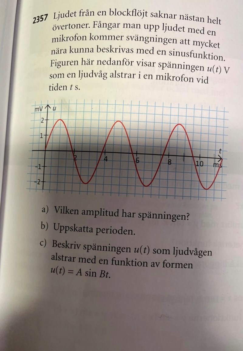 I figuren så kan du läsa av grafen att det tar 11.5 ms för 3 "varv", alltså tar det ca 3.83 ms för varje varv, vilket också är perioden. Ett annat sätt att räkna ut perioden på är att räkna diffrensen mellan två vågtoppar. Första vågtoppen har t-värdet ca 1. Andra vågtoppen ca 4.8. Skillnaden motsvarar då perioden.