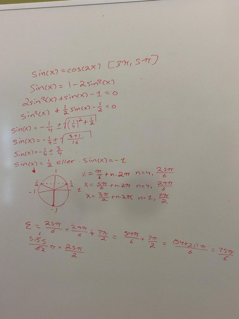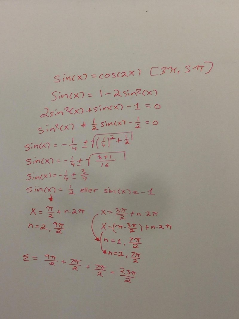25. Sin(x) = cos(2x) . Lös uppgiften och ange summan av lösningarna inom intervallet [3pi,5pi].