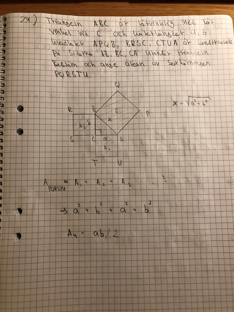 Får 2a^2 + 2b^2 när jag adderar areorna från kvadraterna.