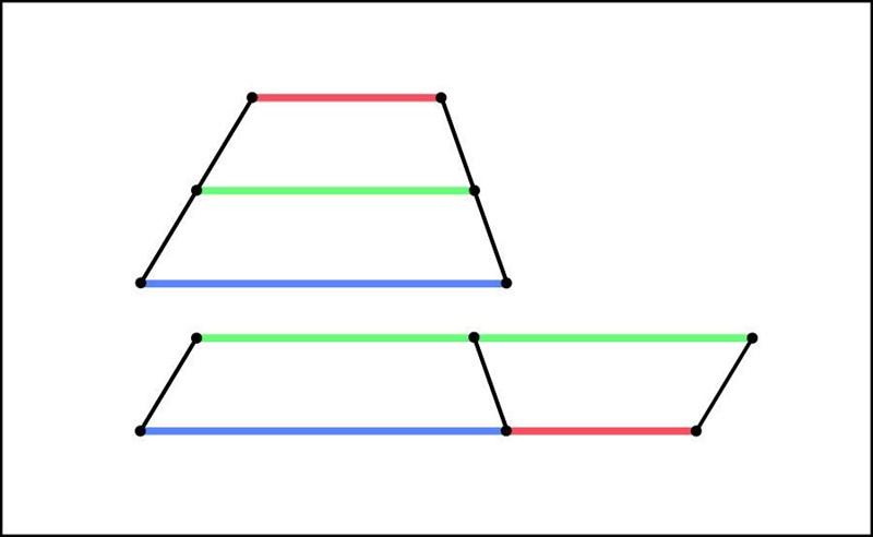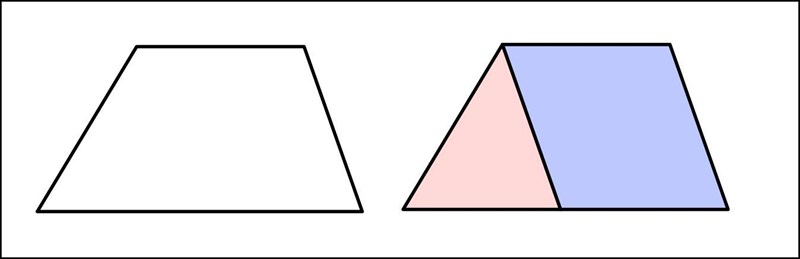 Parallelltrapetser är figurer som man skolgeometrin stöter på förhållandevis sällan. I alla fall mer sällan än trianglar och parallellogram. Därför brukar jag nästan alltid finna det användbart att dela upp trapetser i en triangel och ett parallellogram genom en snitt