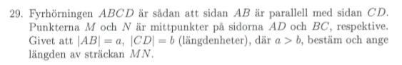 Förutsättningarna indikerar att fyrhörningen är ett parallelltrapets där den långa undre sidan AB är parallell med den korta övre sidan CD. Rita en sådan figur och markera mittpunkterna (M respektive N) på de två sneda sidorna AD och BC. Dra den raka linjen MN.