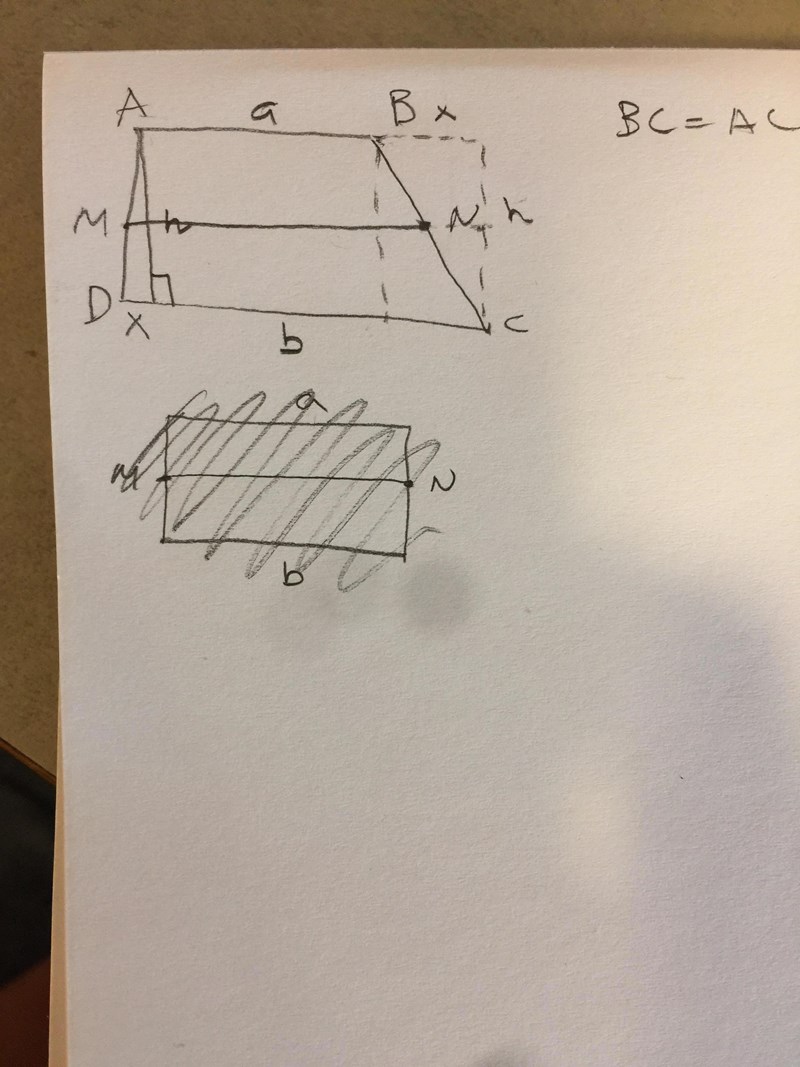 Är linjen MN parallell med sidan AB? Om den är det så har du tre stycken likformiga parallelltrapets: ABCD, ABNM och MNCD.